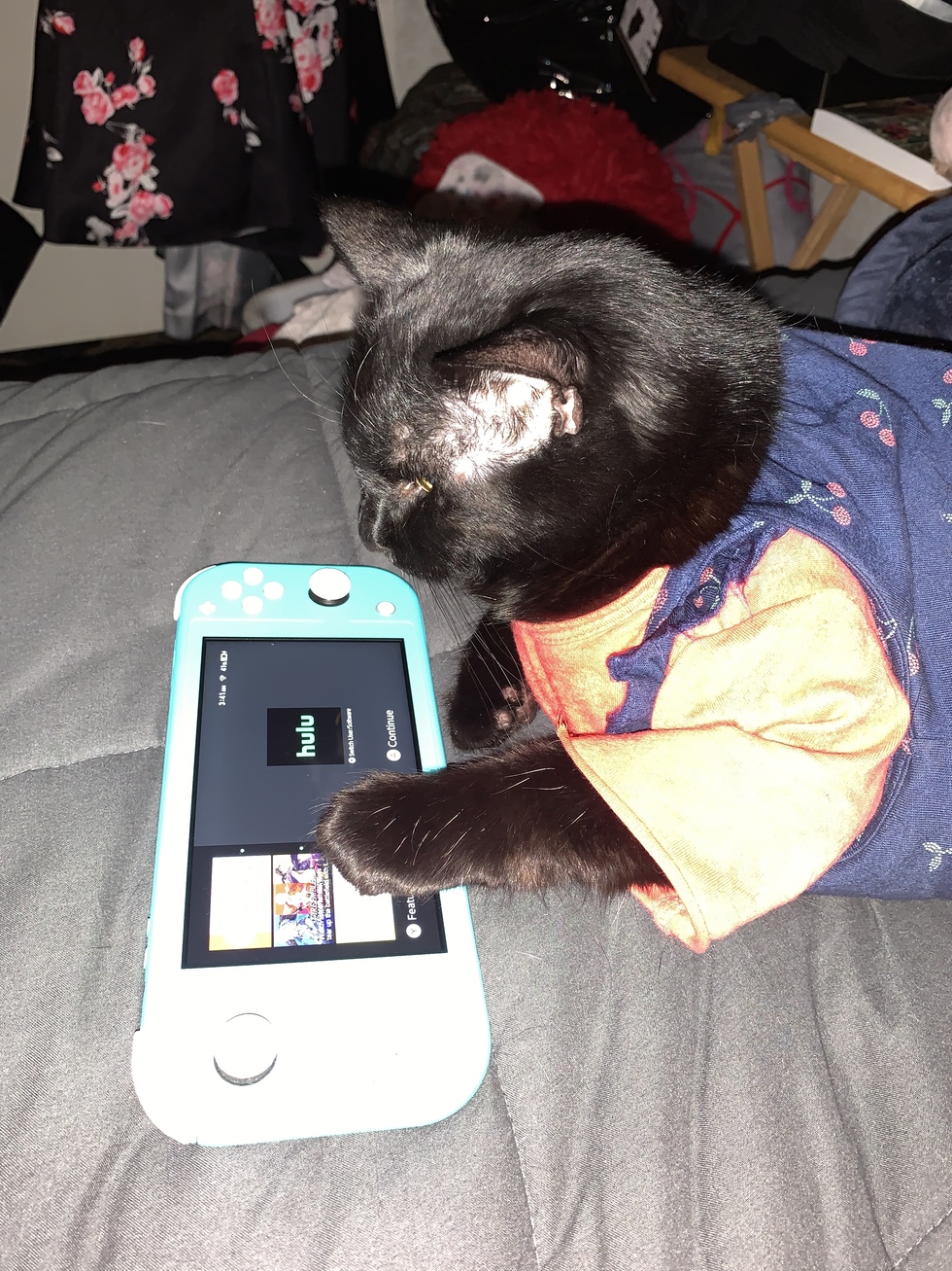 Your Pet's Bio/StoryChloe was adopted from the DDFL 8 years ago. I don’t know anything about her previous life, other than she was fully declawed, and lived in the streets. She is incredibly strong, and I have no doubt she was queen of the ally. Now that she’s a house cat again she loves nothing more than food…. And napping on anything soft. She also is weirdly obsessed with popcorn, but isn’t allowed to have it. We are not sure why she likes popcorn so much…. But she can tell the difference between a bag of chips and a bag of popcorn being opened…. All I have to do is open it and no matter where she was before, she’s at my feet, staring up at me with her giant green eyes. Thank you DDFL for my giant squishy weirdo. <3