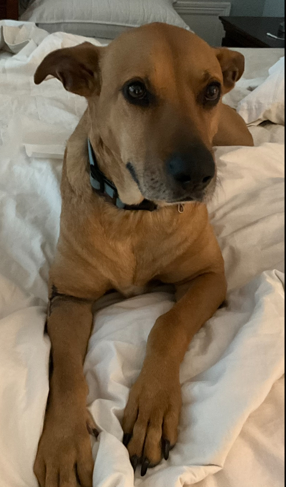 Your Pet's Bio/StoryTwo year old mixed breed rescued from Houston shelter with dreadful history of abuse. Used for target practice with residual buckshot observes throughout his body. He came to Denver with extensive collar/harness burns, broken hip, large lipoma and eventually heart worm positive. FHR surgery at DDFL. Did well for 6 months and then converted to Heart Worm positive. Painful treatments and slow recovery. Settled in and is very calm but insecure. Gets along well with 3 rescue cats and they all sleep together but in separate spots on the bed. He is 22% Pit Bull but has no aggression. He is a great traveling companion & has been to Grand Canyon & Jackson Hole. Regal old man now that loves lying in the sun,