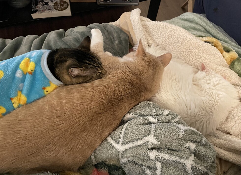 Your Pet's Bio/StoryCowboy (buff tabby) is the sweet baby boy of the family, adopted in November 2021. He loves water and snuggling with his mom. Cinder (brown tabby) was adopted in January 2021. She has 4 teeth due to stomatitis and loves biting her mom on the head when she's hungry. Yuna (white) was adopted in 2017. She passed away on July 20th, 2024. She was deaf and screamed like a peacock when she wanted attention. Her favorite activity was snuggling under the blankets in her mom's lap.