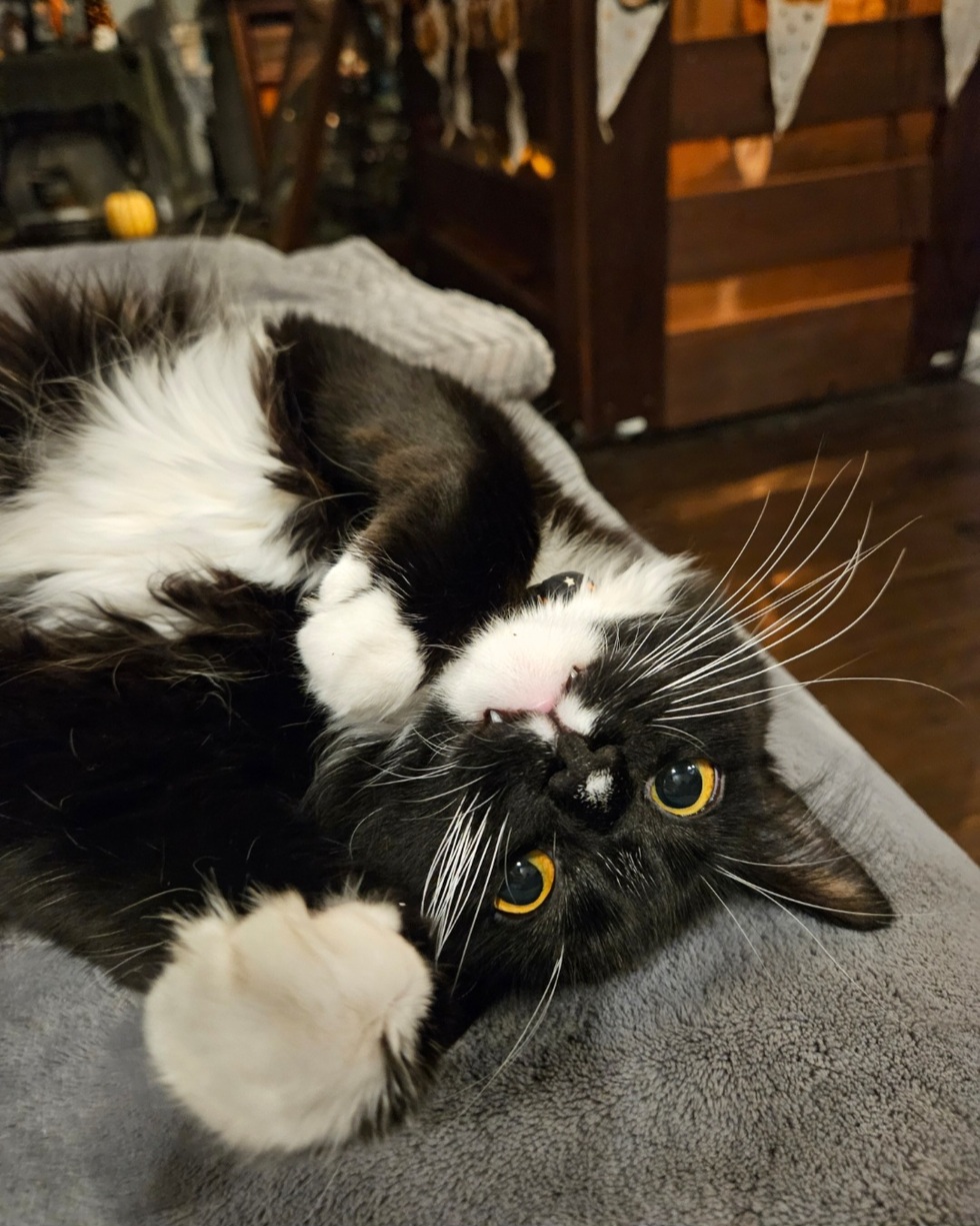 She was named after Winnie Sanderson from the movie Hocus Pocus, so spooky season is her season. Winnie is the sweetest girl who loves to play with her toys, eat treats and watch the birds outside.