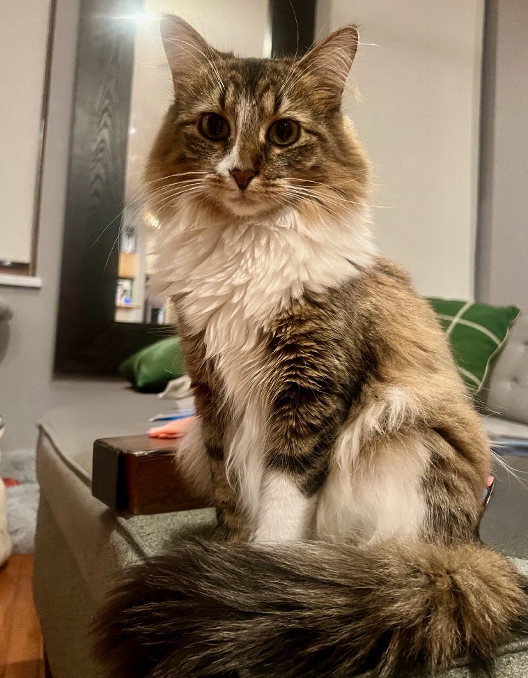 Winnie (Winifred if you're feeling formal) was adopted from ECMCR when she was 6 months old in February of 2024 and we could not love her more. She is a floofy, playful, and sweeter than sweet girl who loves nothing more than to curl up and snuggle – especially with her best friend Beckett – her 10 year human brother. Her tail is the fluffiest and quite regal and she loves sleeping in whatever patch of sun she can find and chasing her other (feline) brother Wellington, a 14 year old orange tabby, around the house.