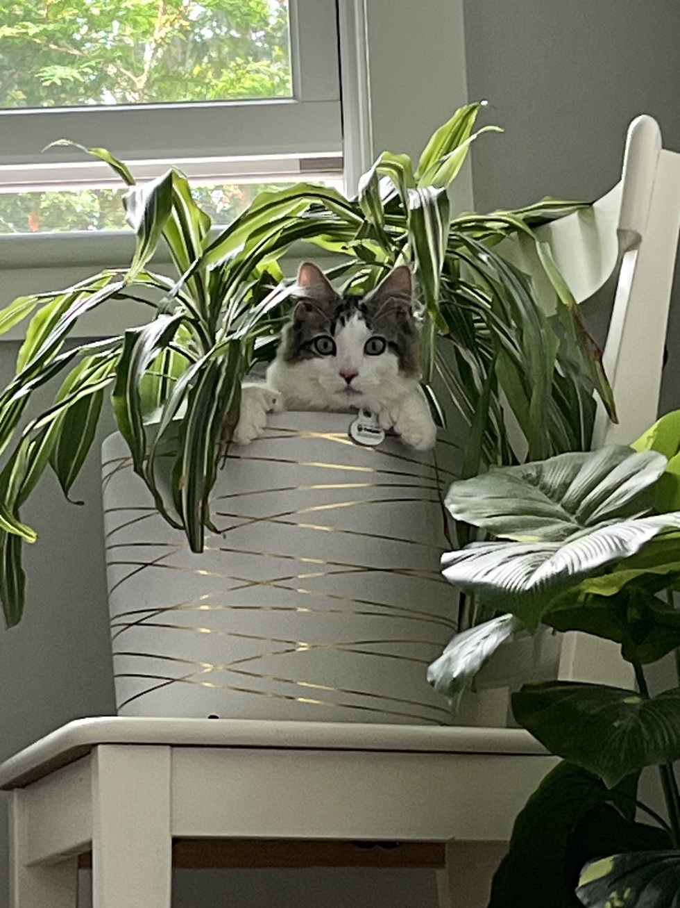 Apparently in addition to playing with his kitty brother Eddie, zooming around the house and sneak attacking anything in sight, Decky-doo is also a plant gremlin!