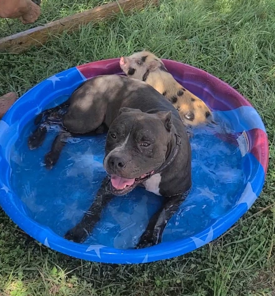 Bones and Moo bonded the moment they met each other. Moo (the pig) would choose to hang out with the dogs rather than other pigs until this day.