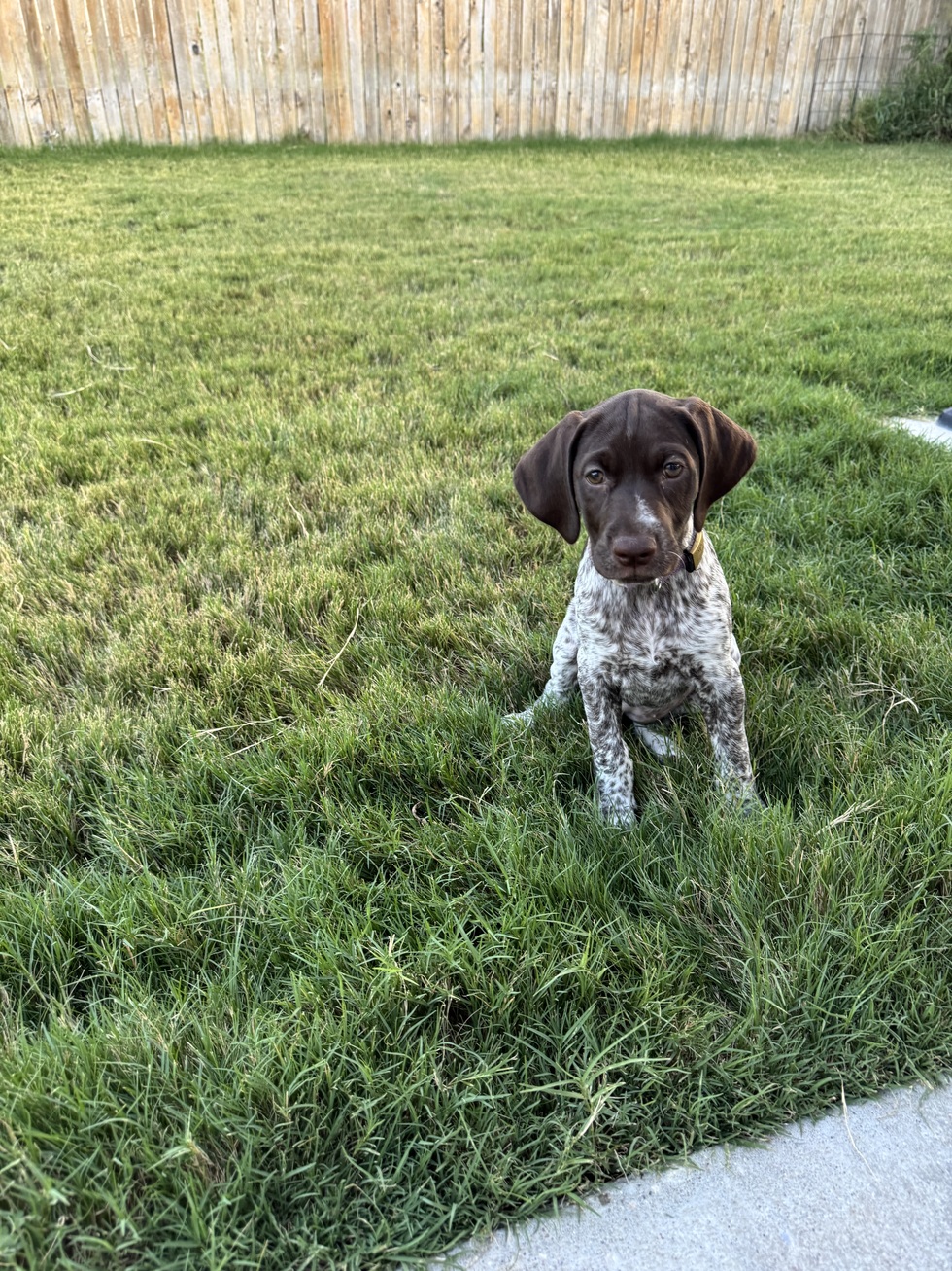 Sylvie’s mom was found wandering the streets in the sweltering Texas heat. Just days after being brought into a foster home with TX GSP Rescue, Sylvie and her 10 siblings were born! She has a 5 year old brother, an English pointer, and a 7 year old human sister. She’s smart as a whip and lives up to the Velcro-dog stereotype.