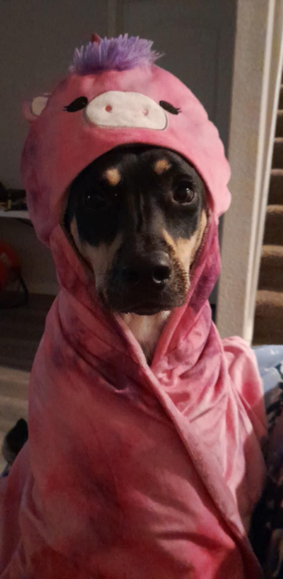 This is Barby-Q. She loves to be wrapped up in her unicorn squishmallow blanket.