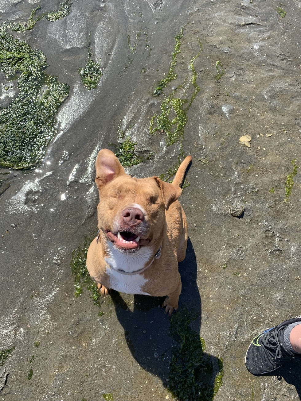 Loki is our adorable 9 year old blind pit mix! She was born blind, but she doesn’t let that stop her from running along the beach, destroying every squeaky toy that comes across her path, and being the most expressive girl ever!