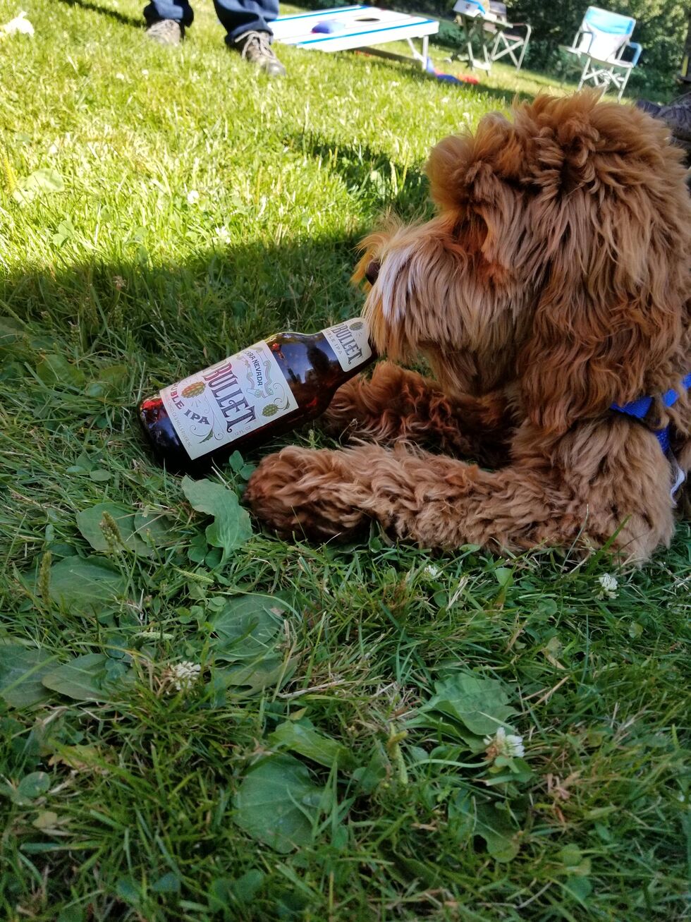 I retired and got baby Ruby in the spring of 2020. The picture is from September that year on a camping trip with friends. Ruby did not drink any beer, but it was a funny pose that we could not resist photographing.