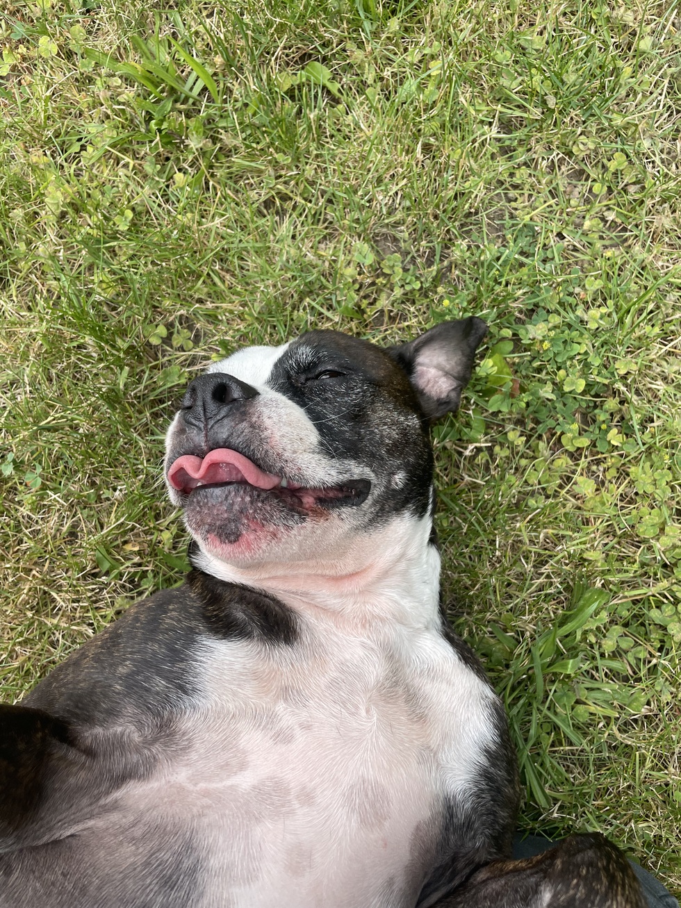Dagger - 8 Year old male, mixed Boston Bulldog Mixed breed. Dagger is the biggest goofball, couch potato, gassy, yet he’s extremely loyal to his family. He loves belly rubs and short walks around the house. Adopted at 2 years old, he grew up on a farm with cows, goats, chickens other dogs and Pigs. He had a run in with one of the pigs and had to be adopted out. My wife and I were willing to take him on and give him an alternative life! He had never had a collar/leash, but turns out he’s amazing on a leash! We love our goofy boy, we’re lucky to have Dagger.