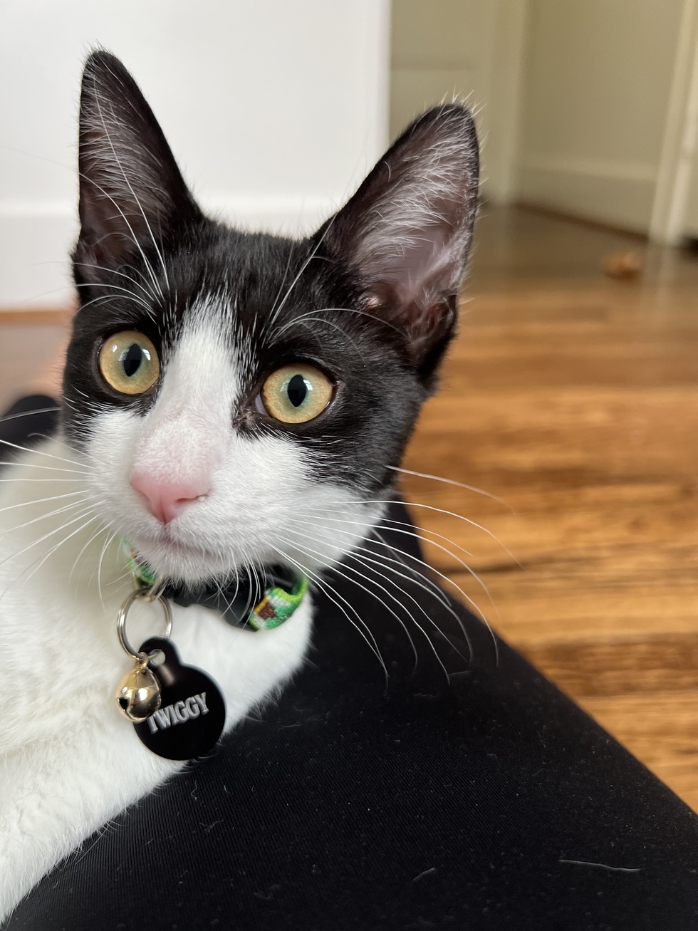 Twiggy was found on the road in front of McLeod. She is missing a tail but not lacking in personality. She loves toilet paper and toy blocks that belong to her human brother.