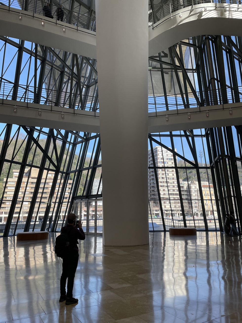 Photograph DescriptionVaulting glass spaces under titanium roofs, the Guggenheim in Bilbao adds city windows to its collections.