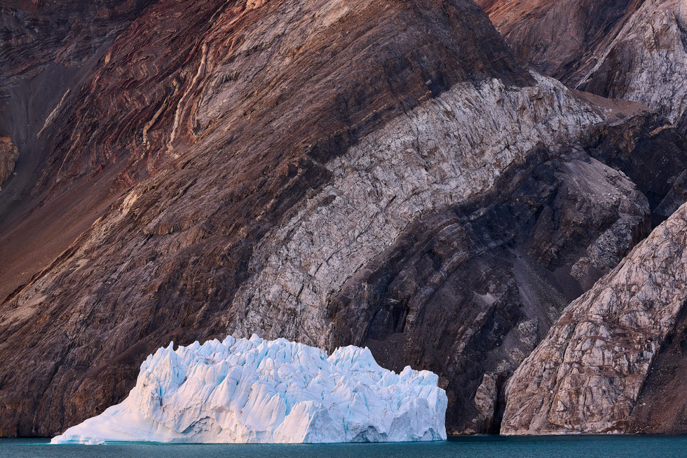 Photograph DescriptionI took this photograph in Eastern Greenland, where towering icebergs detach from glaciers and drift in the North Atlantic. We were sailing at dawn in a fjord when we passed by this iceberg that was partly lit by the warm light of the rising sun as the iceberg was drifting right next to the rocky cliff of the fjord, creating a striking juxtaposition between the smoother shape and cooler hues of the ice and the jagged texture and warm hues of the rock strata.