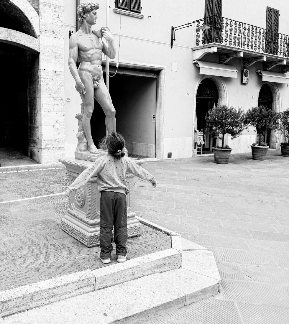 Photograph DescriptionShot of a young girl who ran up to the statute of David in a small town in Tuscany. She threw her arms out and stayed like that until her mother called for her to get away from it.