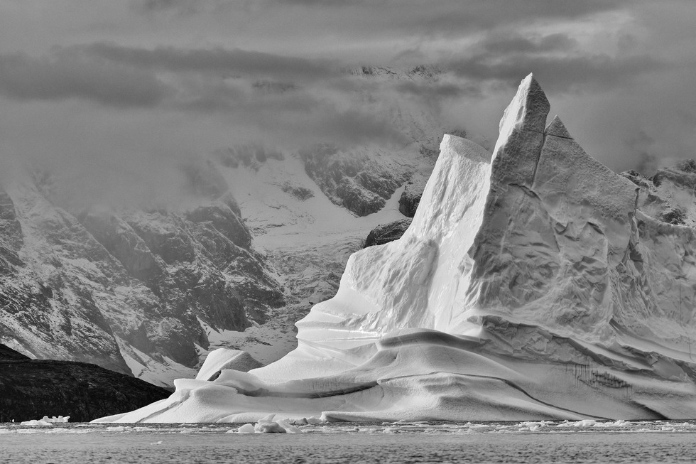 Photograph DescriptionI took this photograph in Eastern Greenland, where towering icebergs detach from glaciers and drift in the North Atlantic. When I was passing by this massive iceberg the sun briefly peeked out of the cloud cover and lit a face of the iceberg, leaving the mountains and glacier in the background in the shade, wrapped in stormy clouds. I love this shot because it tells the story about icebergs, the glaciers they separate from and the sea they float in. I processed the image in B&W as a study of light, contrast, texture and shape.