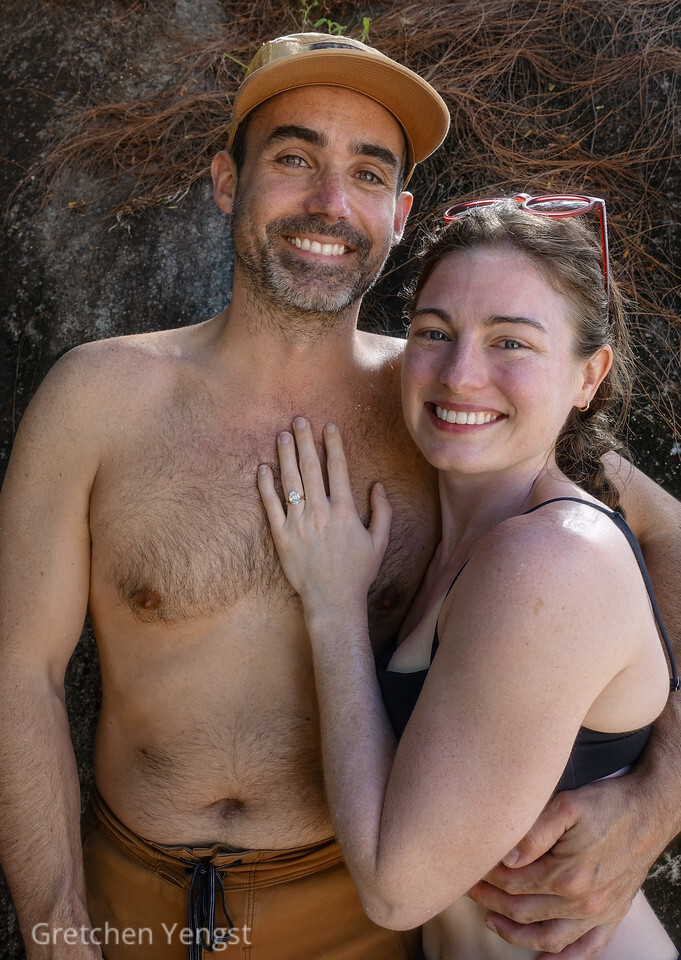 Photograph DescriptionPortrait taken of engaged couple who had just emerged to the beach after an underwater proposal… which was affirmative! The ring was transferred on the beach to the thrilled bride-to-be in this photo. The groom-to-be had acquired the diamond from his grandmother and had put it in a new setting just for THEM!