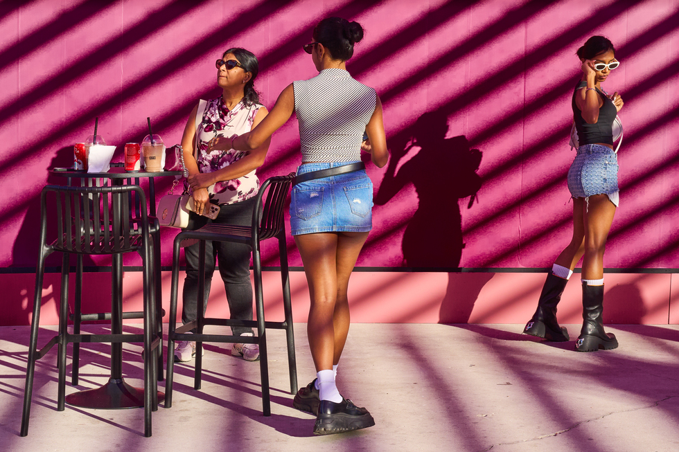 Photograph DescriptionWhile visiting a site unveiling the new Jaguar branding, in Miami’s Design District, I noticed these three women, together, yet each in her own world. Sunlight filtered through overhead slats, carving dramatic lines across the fuchsia wall. One glanced over her sunglasses, casting a well-placed shadow on the wall.