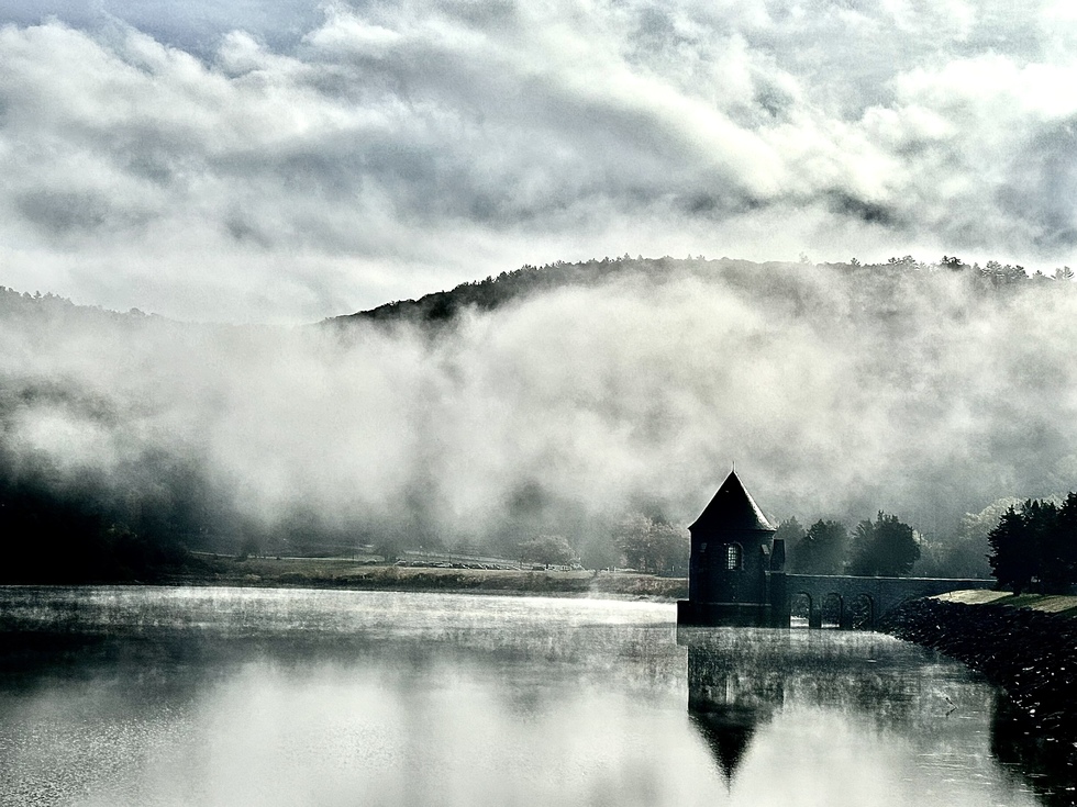 This is a photo of fog over Saville Dam in Barkhamstead Ct