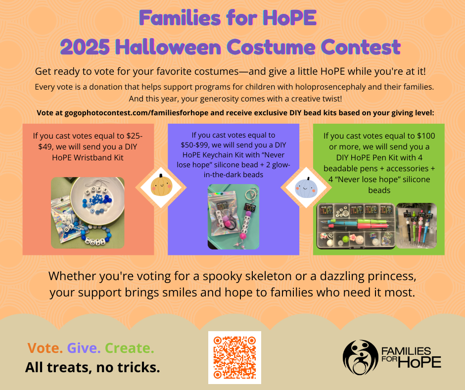 To celebrate our special children, we invite you to share a photo of your child in costume and participate in our fundraising contest! Campaign for your favorite photo by sharing a link on Facebook, Twitter, email, etc. By collecting donation votes, $1 per vote, you'll be supporting Families for HoPE in its effort to bring HoPE to HPE families.