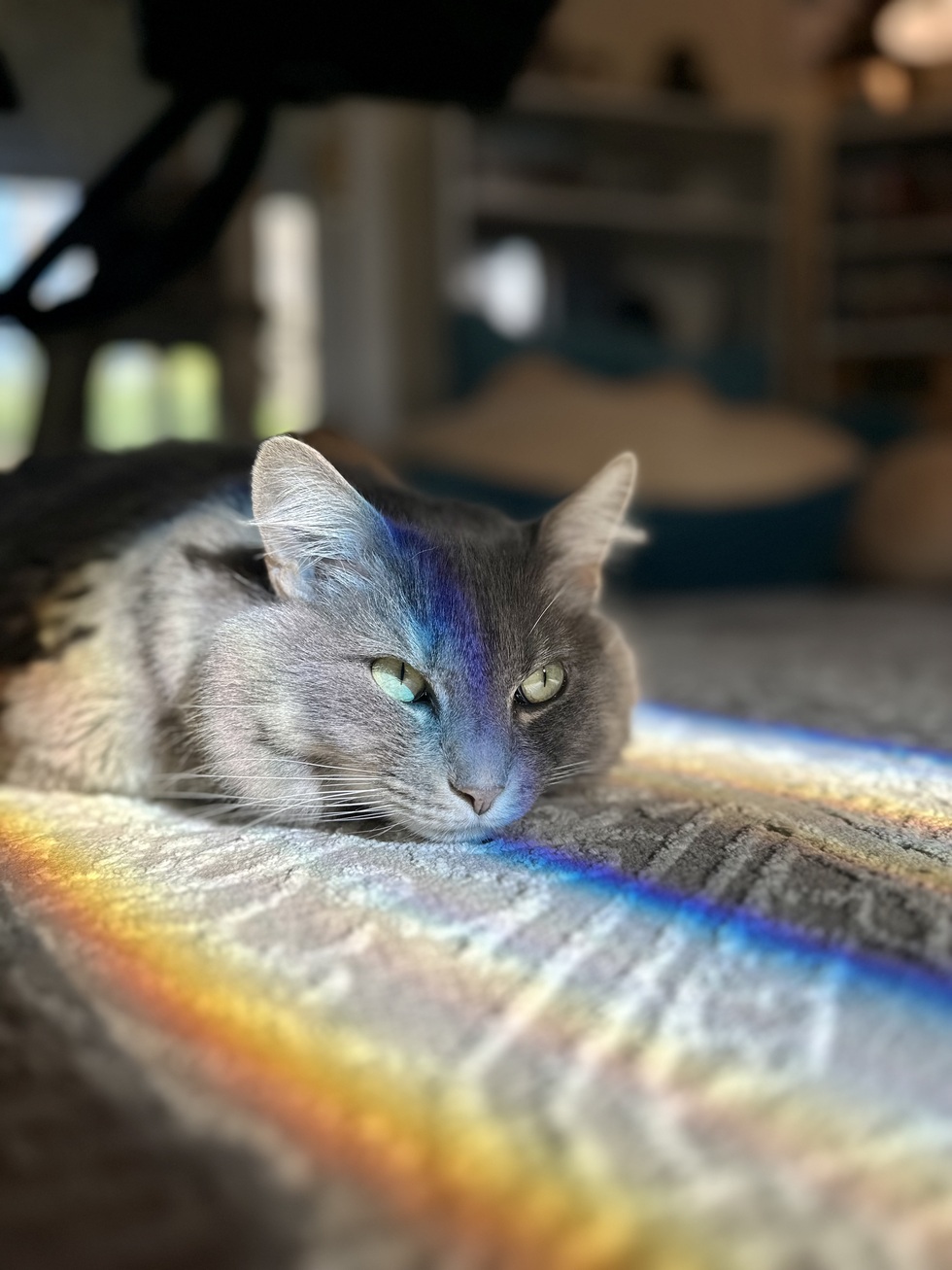 We adopted Winnie 2 years ago from fancy cats. She had been surrendered after being a covid kitten for a family. Her favorite things to do are wrestling with her brother Binx and finding the purfect sun spots for naps.