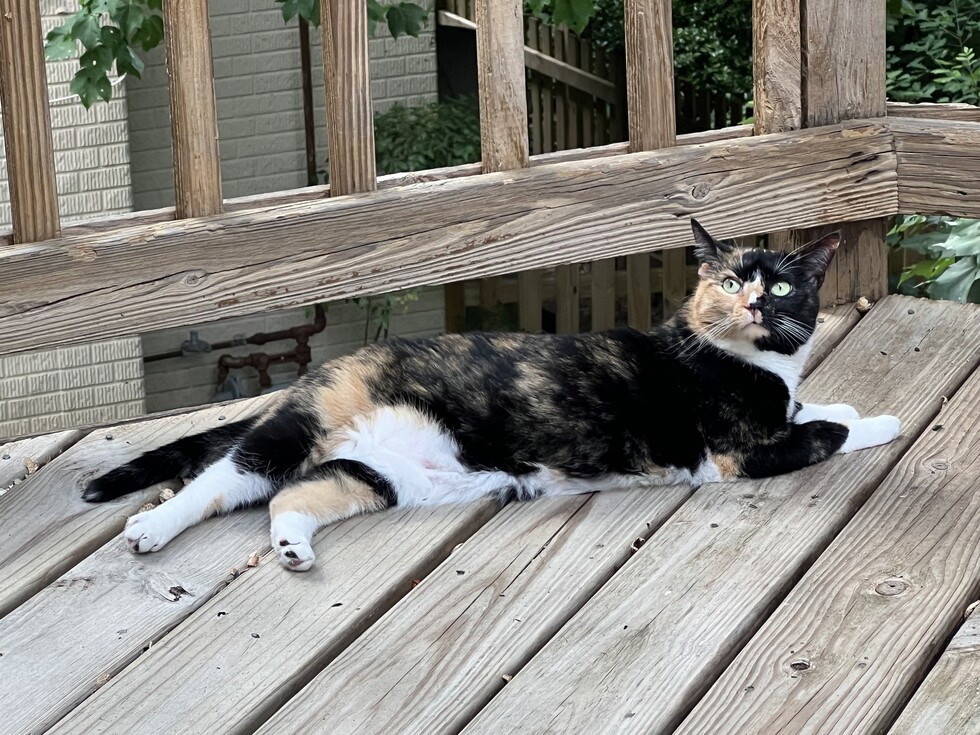 Molly was initially a short-term foster for us, as her real foster mom was going on a vacation. We expected to have her stay with us and our other indoor cat Donald for about 2 weeks. On the first night, she tried to jump up on the fireplace mantle, but didn't quite make it - she fell back onto the couch where I was sitting and she knocked my glass of red wine to the floor, breaking the glass of course. As the days went by, we grew to love her. Yes, we adopted her and she knows how to deal with Donald so they are both happy.