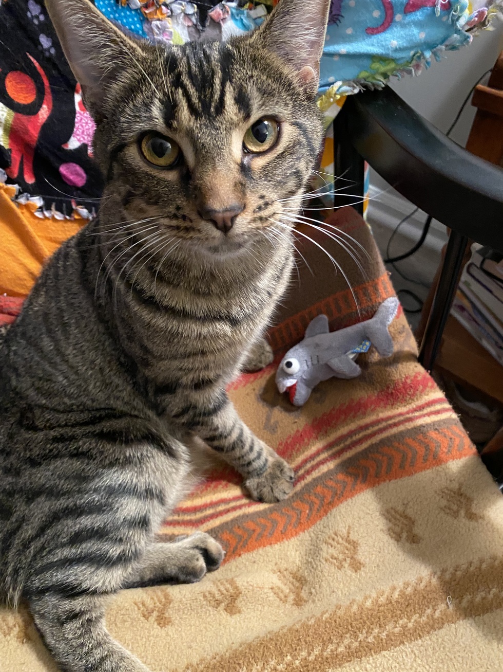 Maggie Mae and her sister Katie came to us from Fancy Cats on December 4th, 2022. It was a matter of Divine intervention, because they were exactly perfect when we laid eyes on them. Maggie Mae loves her toys, especially her shark.