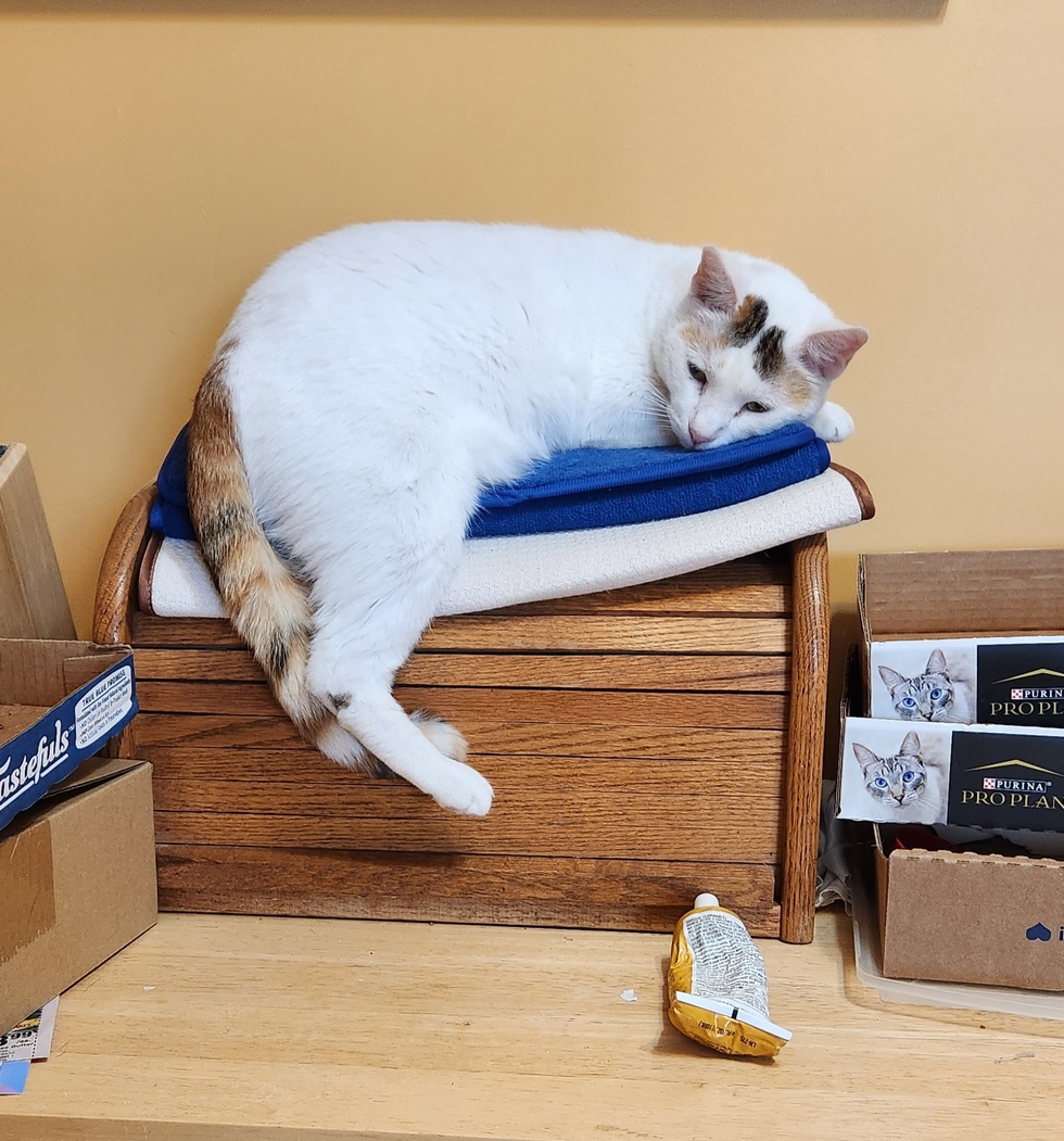 I’ll admit I am a failed foster with Tallulah. She had a rough life on the streets of Kuwait and while on the street had babies who were also rescued. When she came to the U.S. she was very scared and needed a place where she could feel safe, so I fostered her. After a few months she seemed to realize she was not going to be harmed in my home. She wanted to come out of the bathroom and meet the other cats she had seen under the door and since no cats had been hissing I was fine with that. I never know where I will find her sleeping since she seems to feel comfortable anywhere in the home. She makes me laugh!