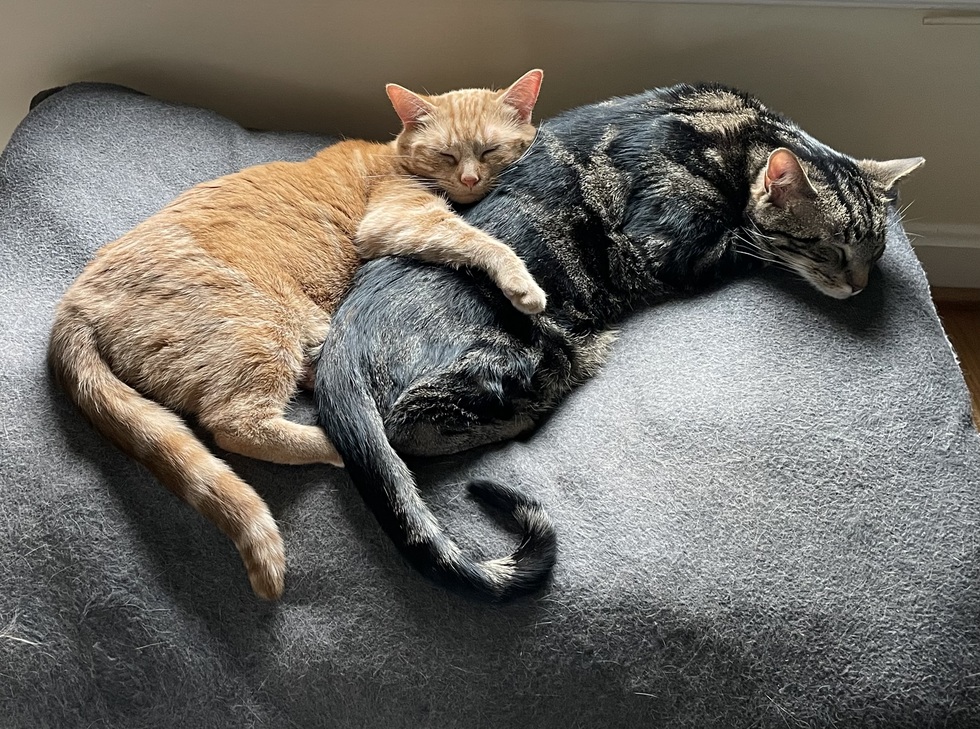 Bruschetta (gray) and Gretta (orange) met at Mount Purrnon, and quickly became inseparable. While Bruce was terribly shy and liked to hide, Gretta ventured out and found them both a forever home, where they rule the roost, and continue their legendary cuddle sessions.