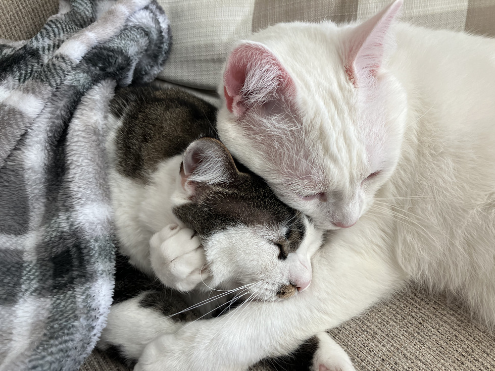 Basil was rescued from outside after suffering with him for over 6 months to earn his trust and has FIV but has been vaccinated for FELV. Birch was a Fancy cat with FELV and FIV who had been in shelters for over 7 months. They both had hard starts and love each other and are loved and will never suffer like they had again!