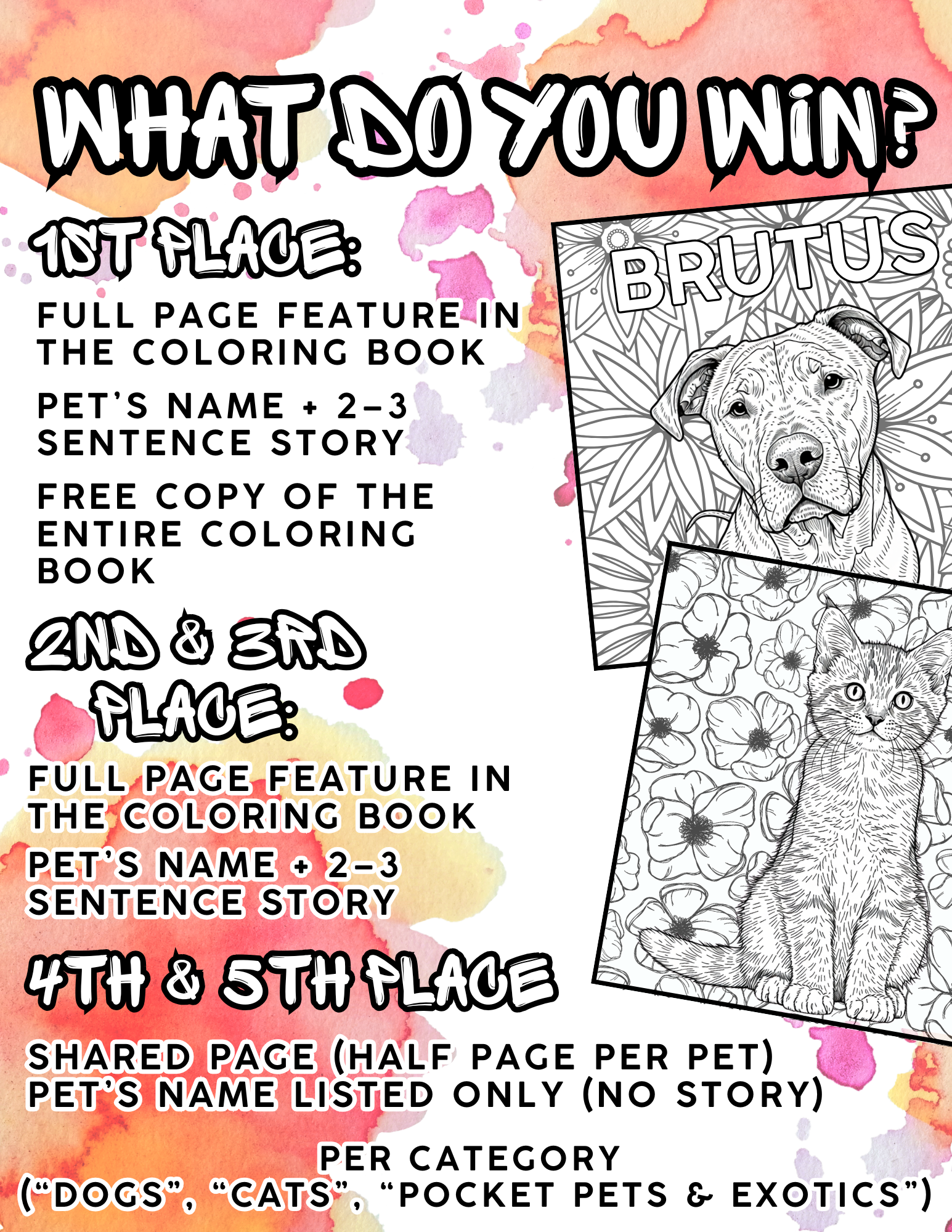 - The first place winners in each category will also receive a free printed copy of the coloring book their pet will be featured in.