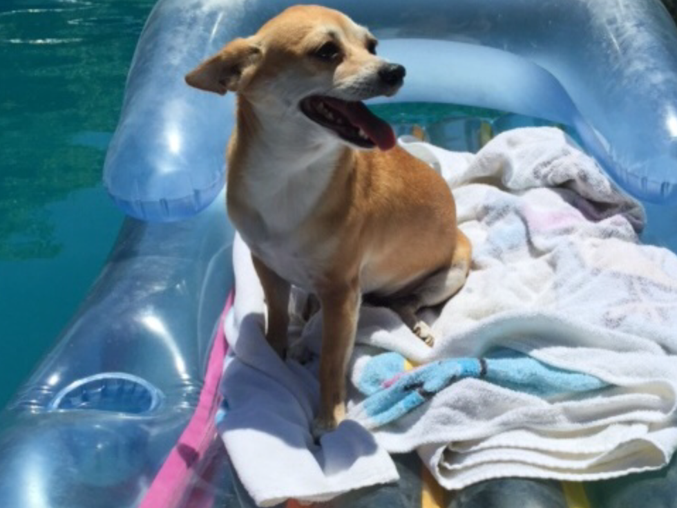 My son Trevor wanted a Chihuahua when he was younger and a friend told me there was one at the Fayette County Dog Shelter. Sure enough, there she was. She was apparently apprehended with a couple of other dogs running the streets of Washington CH. The rest is history. As you can see, Lupe enjoys spending time in the pool.