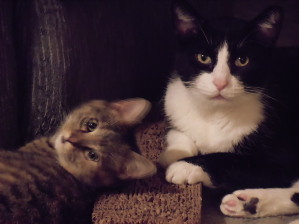 SIMON TURNED 11 THIS YEAR, CASSIE JOE TURNED 4..THIS WAS TAKEN WHEN CASSIEJOE AND SIMON WERE LOUNGING AROUND. SIMON WAS ADOPTED FROM MONTGOMERY CO. HUMANE SHELTER IN DAYTON, CASSIEJOE FROM FAYETTE SHELTER THRU PETSMART