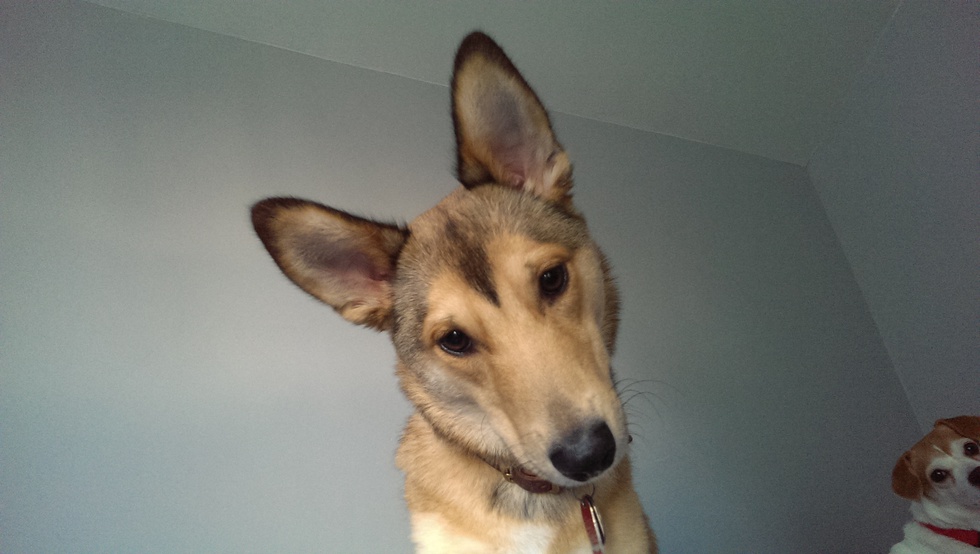 Rollie, with Ziva photobombing. (Ziva crossed the rainbow bridge back in 2015)
