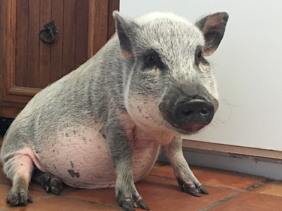 Burley is a 3 yr old pot-belly pig. He has a younger sister named Elsa that is a blue-heeler and tries his patience, but he has learned to accept that she daily grabs his back leg in her mouth to pull him back home. His 3 cat siblings like to smell noses with him and listen calmly to his many exclamations. He really does love to eat most anything (except surprisingly cabbage, peppers, celery, or onions) and will walk on his hind feet to get a bite of something delicious like watermelon. He loves to cuddle with us under a blanket and will hide his snout in the crook of our arm so sweetly. I do love the sound of his voice calling out with such love and trust that we are his people and he wants us, just like any 3 yr old child does to his parents.