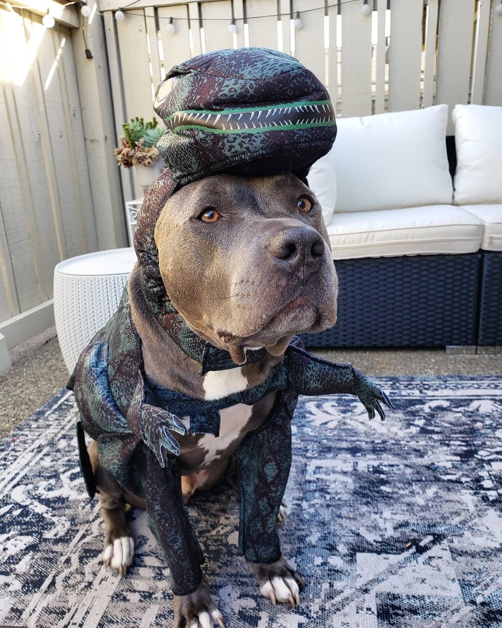 Hi, my name is Dale! I was a former FBR pibble who is now in the bay area living my best life with my family! I will do anything for veggies or a lick of a caramel apple pop.. even let mom dress me like this. Vote for me!