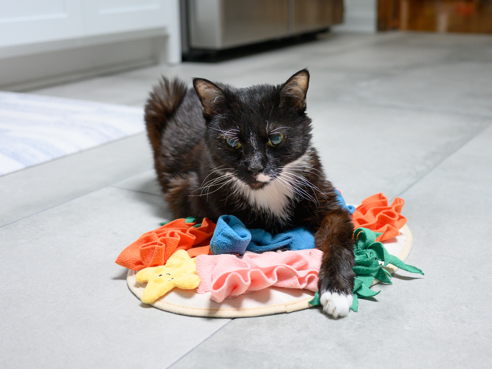 My name is Autumn, but my family and friends call me Bautumn. I was born on the streets of D.C. and raised by dogs, but at six weeks of age I was rescued and quickly found my forever home. Although I have four “sister” cats, I still have lots of doggie in me! I love to play fetch, follow my mommy around the house, enjoy a good belly rub, and am so happy when I get new dog toys (like the one I am sitting on in this picture).