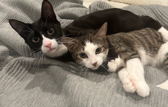 Pauly and Cassie, littermates, were adopted in January at 5 months old and continue to inseparable. They can be found playing with their 2 human brothers and the newest family member, a Labrador retriever puppy. They can always be found laying next to each other or on each other.