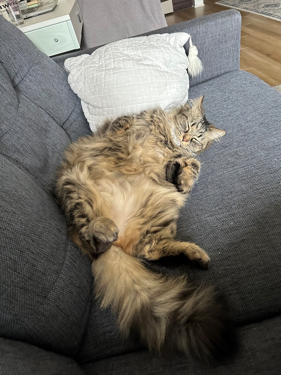Tucker is a sweet giant fluffy boy who loves lounging in the sun on his favorite windowsill. His favorite activity is birdwatching or sleeping with his tummy out. He was adopted from FFGW in 2022 and is so loved.
