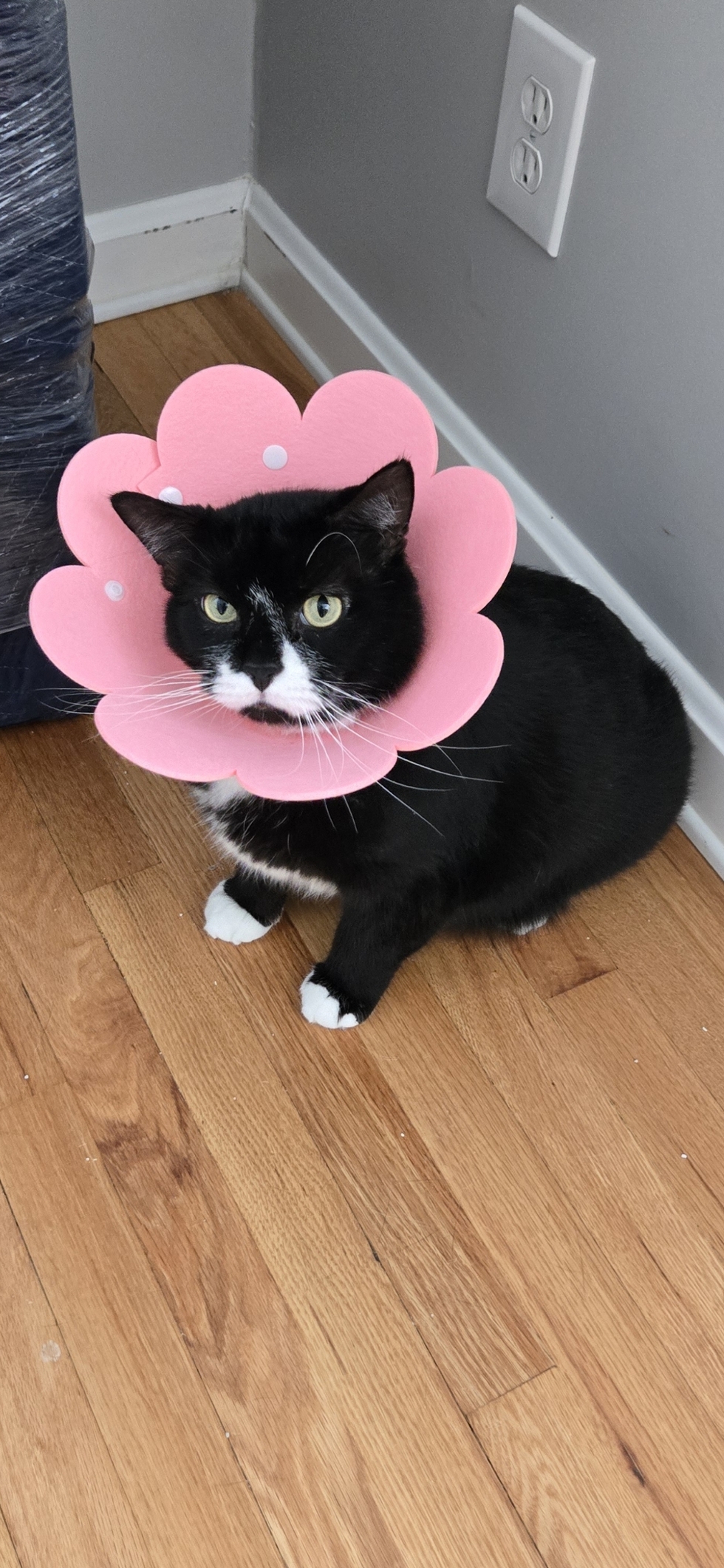 Frankie is a tough little dude who was rescued after showing up in his human's father's yard with a massive neck wound and starving. He's making an amazing recovery and is so handsome, especially in his post-surgery flower cone.