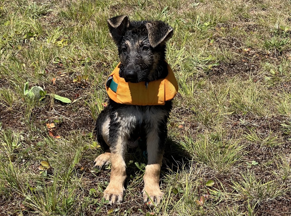 Fred is from Fidelco’s F31 litter. He is enjoying time at home with ‘big brother’ Uno. Here Fred is pictured in his swim vest in the Adirondacks north of Saranac Lake.