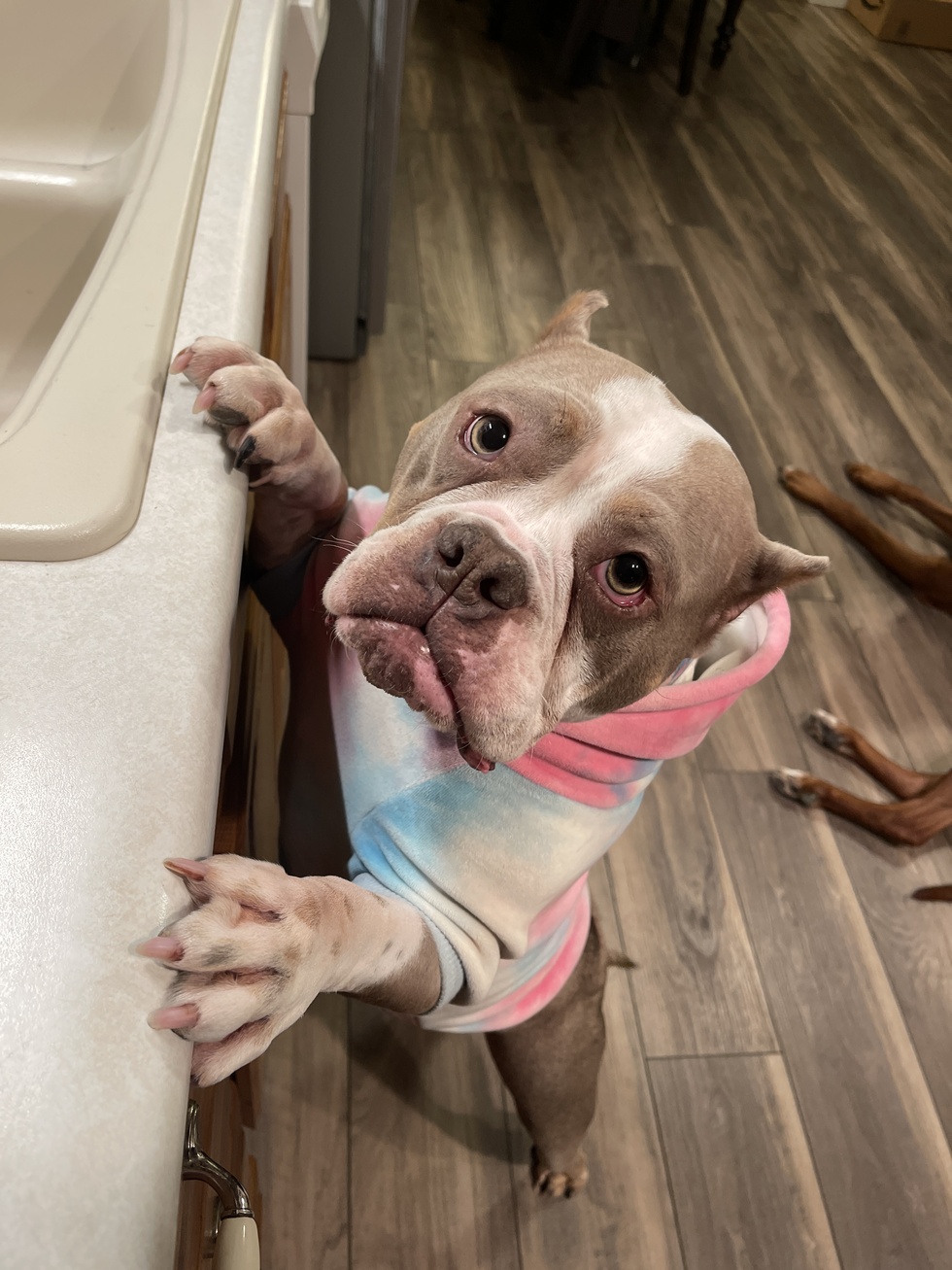 Olive was used for breeding tiny little meatheads and lived outside until she was taken to the shelter and then sent to rescue. The moment I saw her picture, I knew she had to be mine. Then, I went to meet her and that was the beginning of her new life. She has so much personality and it is hard not to love her squishy face.