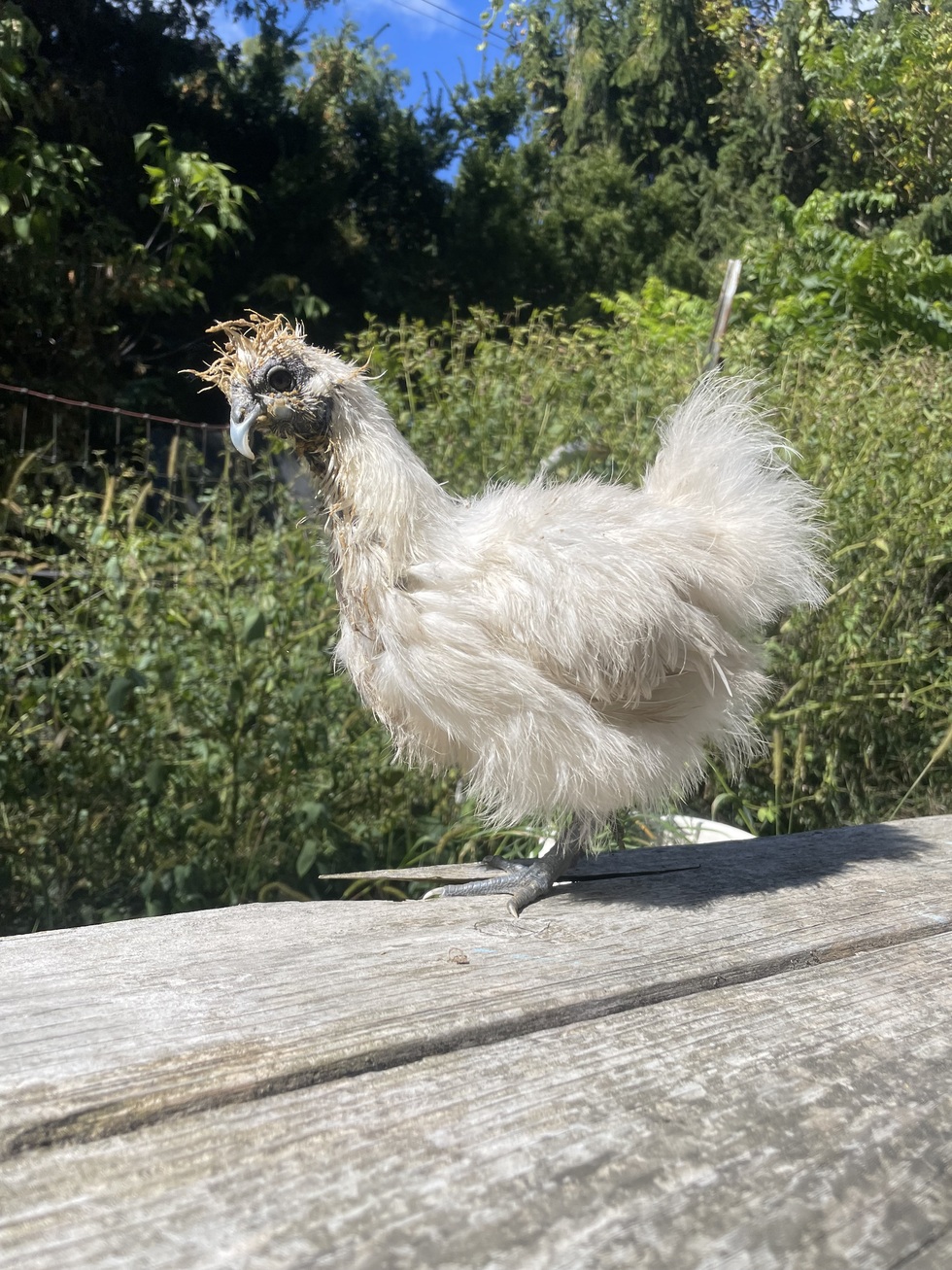 Feta is a crossbeak hen who I took in to join my special needs chicken flock. She eats soaked food and needs daily baths in order to keep clean but is the sweetest girl, she loves her friends Kevin and Jerusha as well as dust bathing and perching on peoples’ shoulders.
