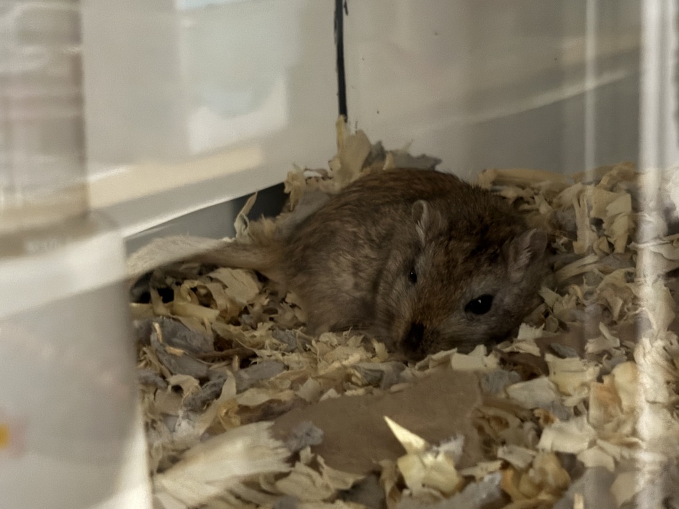 Daddy is a 2 year old Gerbil and has quite the backstory. When we first got him he was Charlie along with his “brother” Nick. They turned out to be brother and sister, when we found their 6 pinkies. He is now named Daddy and his SISTER is named, Mommy. He has split custody over his 2 children, Red and Pikachu. The other four were put up for adoption and went to new loving families.