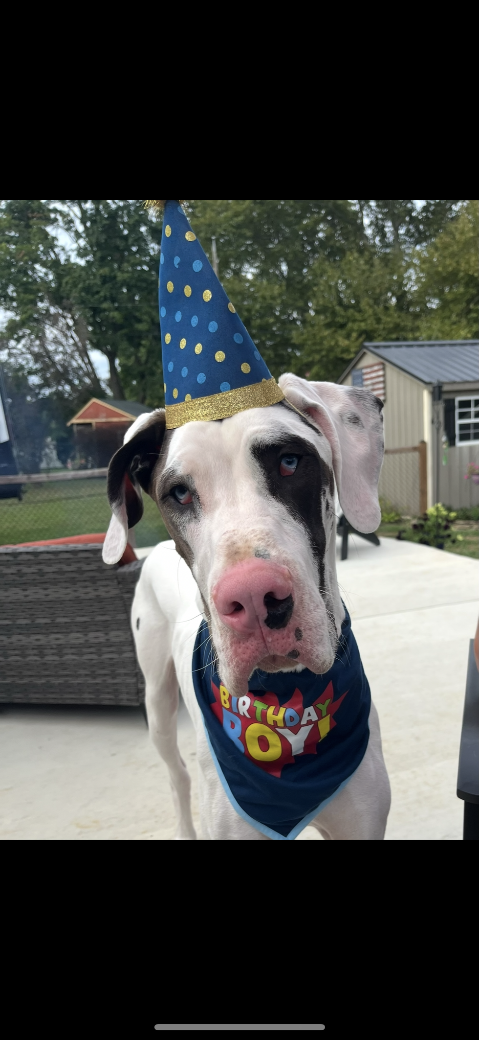 Jakey came to us as a rescue with knuckling on his leg all bent…he is now a happy straight legged giant toddler! He is a double harlequin Great Dane that is also deaf but reacts to commands.