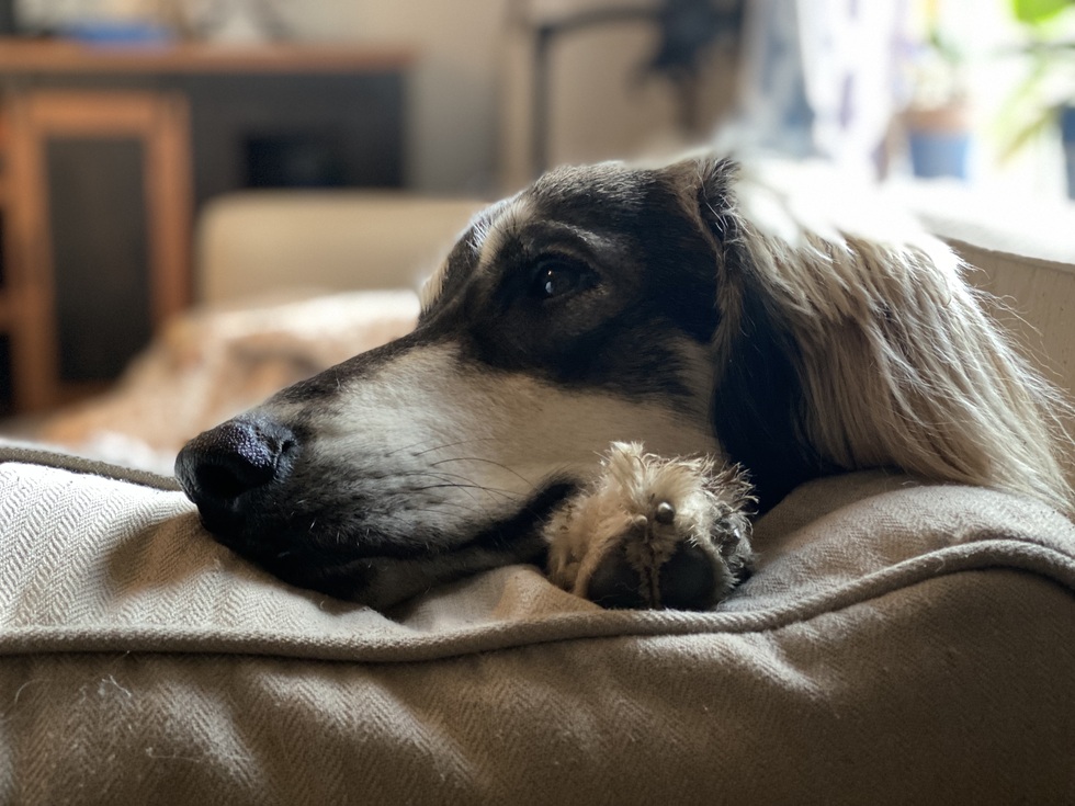 Turk is a Great Pyrenees and Afghan Hound mix pup rescued through the Humane Society of NCF with his siblings at around 7 months. He’s now living his best life in West Virginia by running faster and napping harder than his GSD rescue pup brother. We love our doggo that goes from sad donkey (when it’s raining outside) to prancing pony (when he can run outside). Here’s a pic of him being sad donkey. He’s turning 4 next week!
