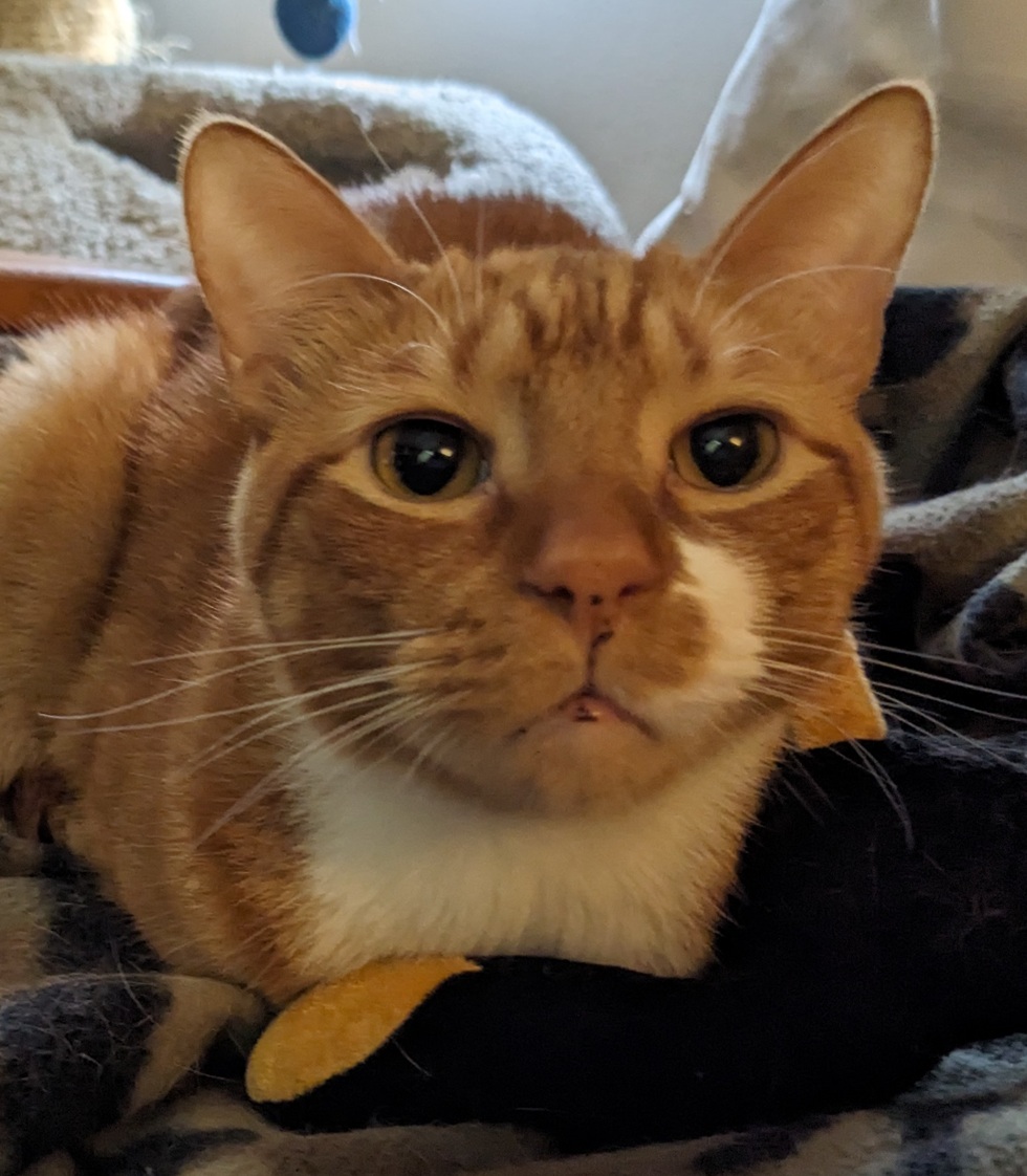 My name is Tango. I (along with my two brothers, Chester and Cheese), was born in a drainpipe and rescued by the neighbors. We were just six weeks old. Now, we're nine and still causing mischief. Chester and I live together, and Cheese is just around the corner. Our mother found her forever home too!