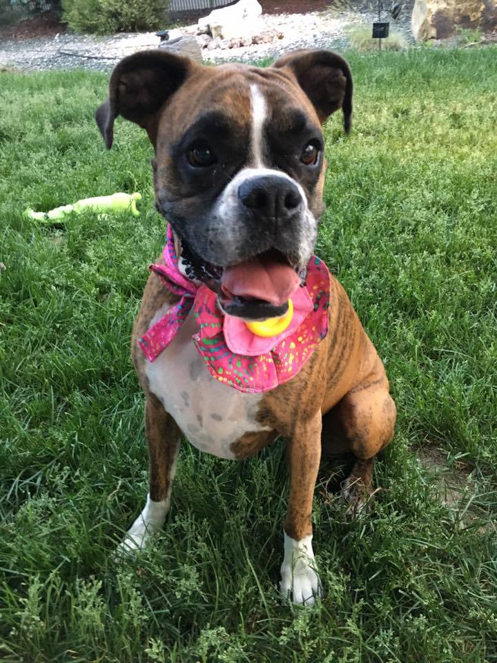 Chloe is a fun loving, energetic and sweet boxer girl. She loves her parents, her grandpa's, her cousin boxer Rubin and all her dog friends. Chloe's favorite thing to do is chase the yellow tennis ball around the yard. She loves playing keep away and jumping super high.