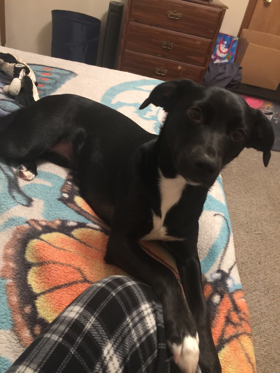 I adopted Luna from the Campbell County Animal Shelter last year; she was skittish and really scared. Now she is absolutely outgoing, and loves to run. She gives "gifts" (toys, socks, shoes, toilet paper) when she's excited to see you. She loves to cuddle. I can't imagine my life without her now.