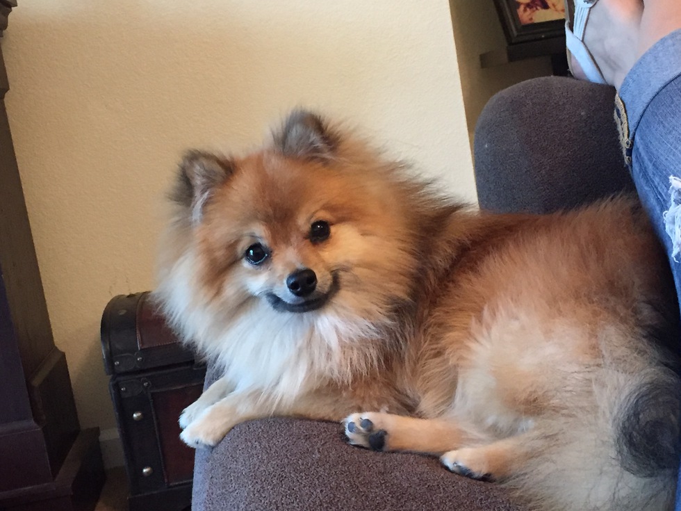This is Carlos! He's a Pomeranian and the most spoiled little thing ever! He acts like a naughty 2 year old! It's his way or no way and he back talks like no other! He gets in trouble but not for long as he knows he just has to hide behind his 12 year old girl or bury himself in the pillows on her bed!