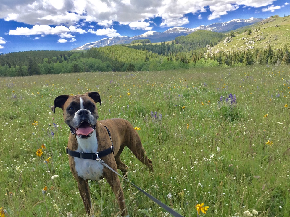 Chloe is a 5 year old, fun loving Boxer. This photo was taken during her first trip to the Big Horn mountains. She could hike all day long and loves meeting people and other dogs on the trails. She's super sweet and especially loves kids. She has the wettest tongue and usually plants one right on your face when you're not looking. When she sees you her entire body wiggles from head to tail!