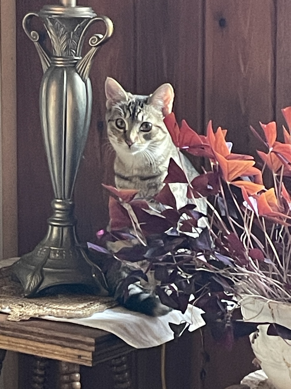 Morlah and her sister, Gracie (not their original names) were adopted  from Focus on Ferals in November, 2024. Morlah is a wonderful snuggler, fun to watch play, and has been so respectful in making friends with my shy elder cat. Morlah is also way too clever. She can unlock the cat door into my workshop! You can see her quiet intelligence in this photo, don’t you think?