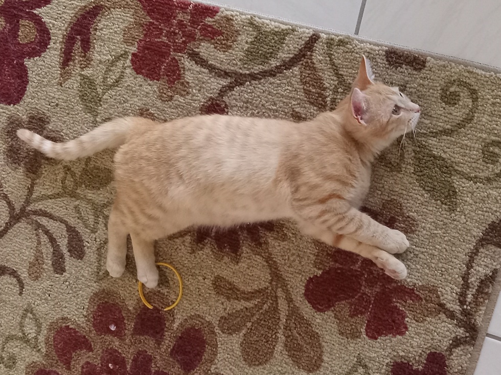 This young stray snuck into my garage last winter, and when discovered, we couldn't turn her away. She has been the best kitten ever, and fit right in with my adult triplet cats. She was a good sport living in my garage until I could get her tested for disease at the vet, getting kitten shots, being spayed after two unexpected heats, and living in the guest room with a cone around her neck until her incision healed.
